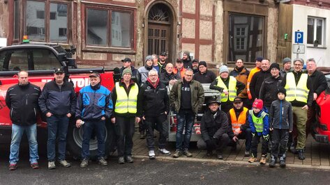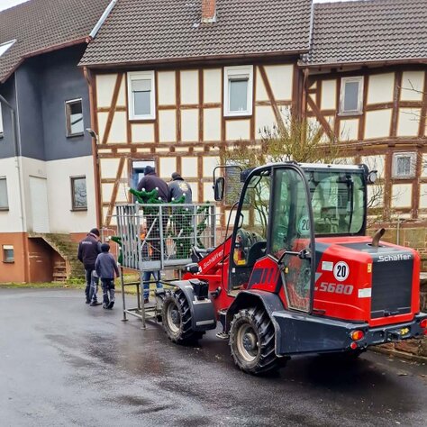 Und so trafen sich am 25. November generationsübergreifend ca. 25 Vereinsmitglieder für diesen Arbeitseinsatz mit Leitern, Werkzeug und schwerem Gerät früh morgens auf dem Marktplatz. Erneut stellte die Fa. Linne ihren Hublader zur Verfügung, der von Hartmut Linne selbst fachgerecht gesteuert wurde. Zudem stellte Landwirt Christian Damm seinen Schlepper mit Montagekorb bereit, damit auch die schwer zugänglichen Stellen rasch und sicher erreicht werden konnten.