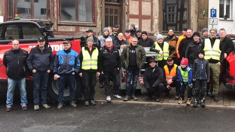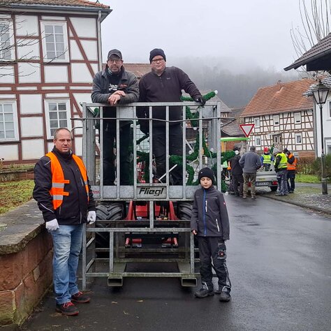 Und so trafen sich am 25. November generationsübergreifend ca. 25 Vereinsmitglieder für diesen Arbeitseinsatz mit Leitern, Werkzeug und schwerem Gerät früh morgens auf dem Marktplatz. Erneut stellte die Fa. Linne ihren Hublader zur Verfügung, der von Hartmut Linne selbst fachgerecht gesteuert wurde. Zudem stellte Landwirt Christian Damm seinen Schlepper mit Montagekorb bereit, damit auch die schwer zugänglichen Stellen rasch und sicher erreicht werden konnten.